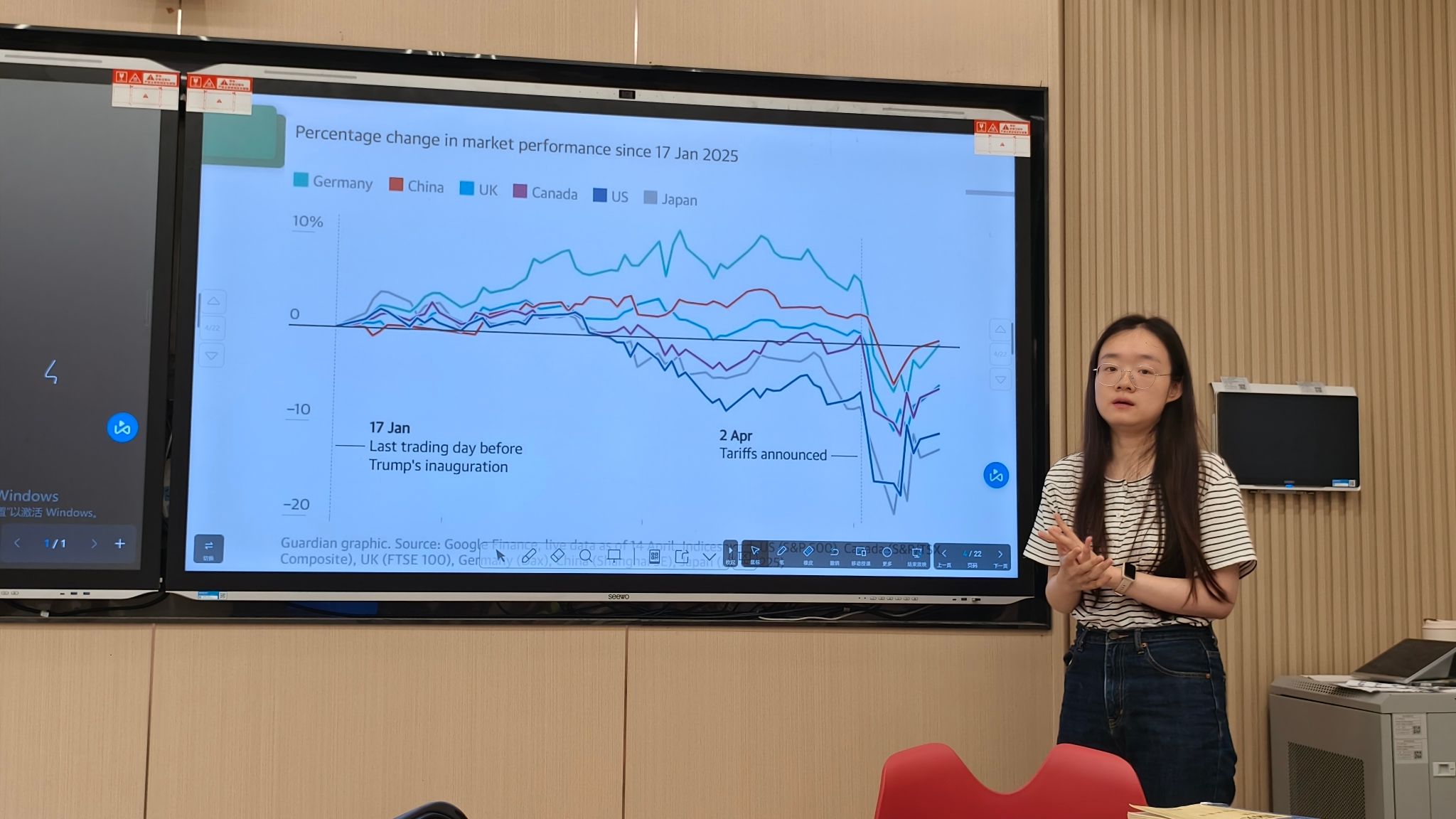 在《国际关系与全球治理》课堂上,朱姝霖老师以专业的金融知识为基石,深入剖析特朗普关税贸易战对全球金融市场的复杂影响,将国际金融市场的波动逻辑清晰展现。随后,杨阳老师进行归纳总结,他不仅串联起零散的知识要点,更引导同学们提炼出关键的金融思维——这种思维并非局限于国际金融市场的风云变幻,而是能广泛应用于大学生活的方方面面。