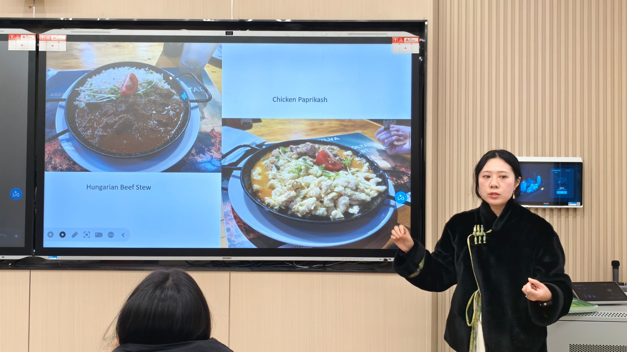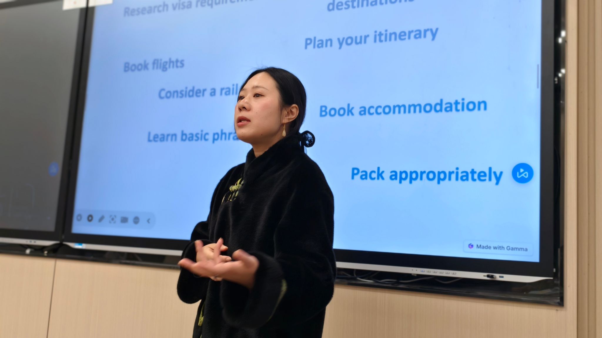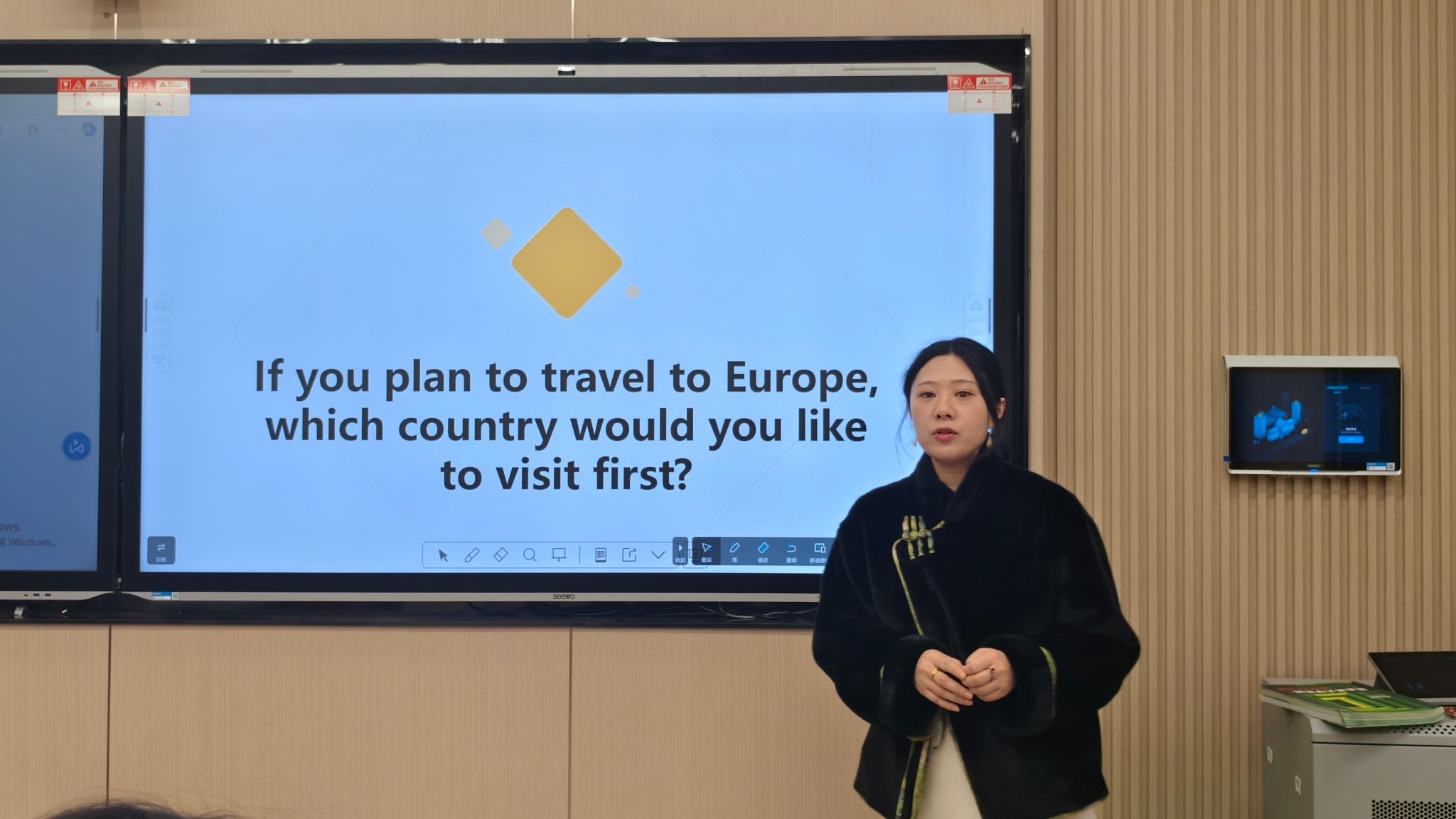 随着邓露露老师的精彩讲解落下帷幕,戴华老师紧接着引领我们进入了一个新的话题:探索欧洲之旅的准备工作。她提出了一个既实际又引人深思的问题:“若我们明年要踏上欧洲之旅,那么需要做哪些准备?在一片思维的碰撞和交流中,戴华老师耐心地倾听着每一位同学的观点,随后为同学们做了精炼而全面的总结。她提到,从签证的申请到住宿的选择,从行李的合理打包到资金的安全携带,以及对目的地的深入了解,这些都是出国旅行前必须考虑的要素,每一个环节都不容忽视。除此之外,戴老师还分享了她去年欧洲之旅的亲身经历和一些有趣的小故事。她讲述了在不同国家遇到的文化差异,以及如何巧妙地融入当地生活,享受旅行的乐趣。这些生动的故事不仅让同学们对欧洲文化充满了向往,更对未来的旅行充满了期待。