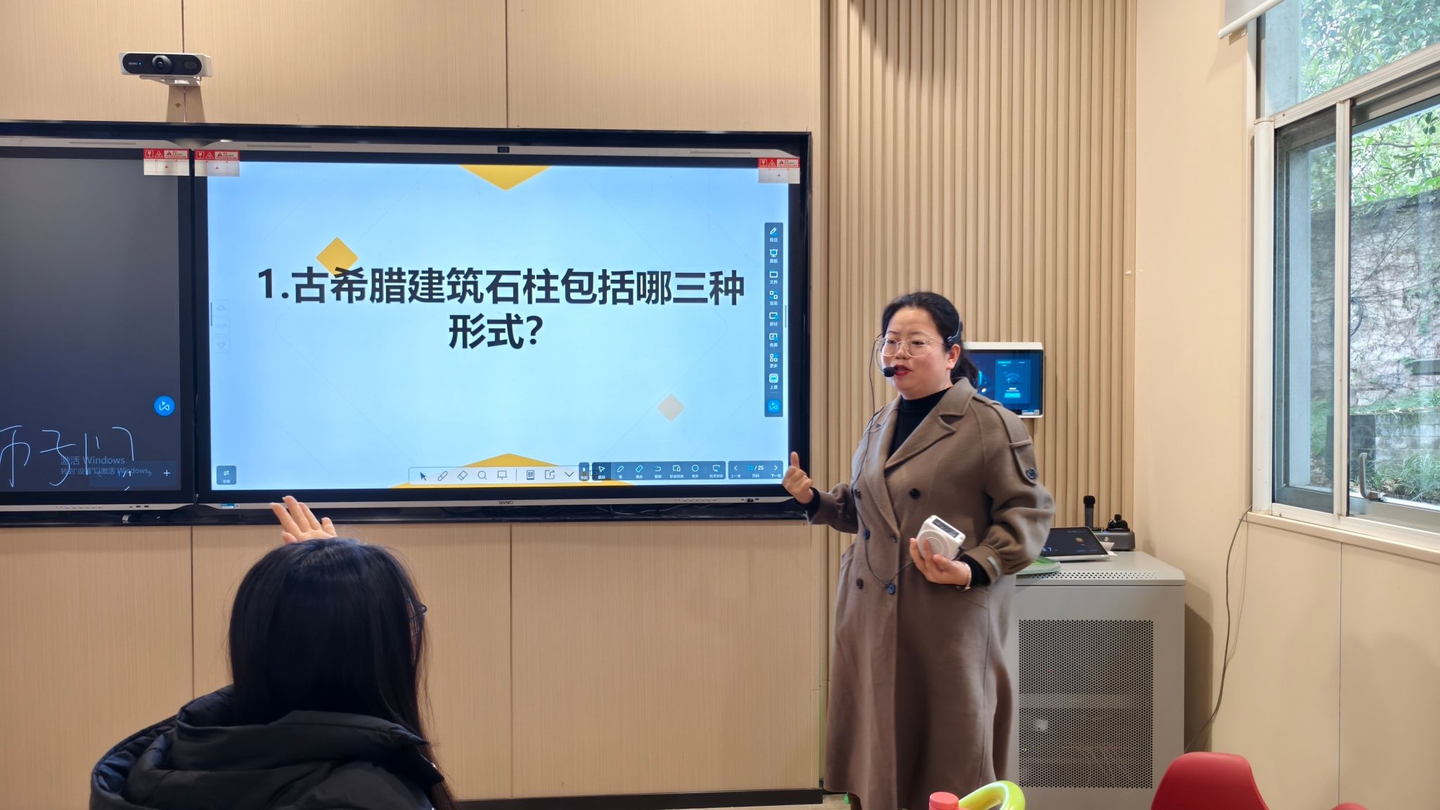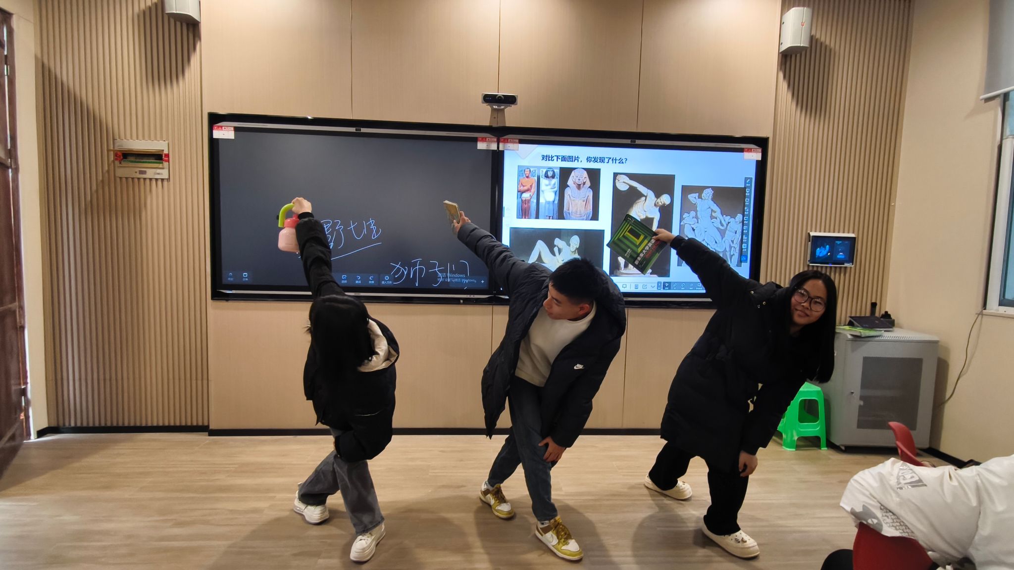 此外,邓老师还向学生们展示了古希腊的艺术瑰宝——建筑和雕塑。她介绍了多利克式、爱奥尼克式、科林斯式三种古希腊建筑柱式结构,并以雅典帕特农神庙为例,向学生们展示了古希腊建筑的独特魅力和精湛技艺。这些建筑不仅彰显了古希腊人的艺术才华,更成为了人类文明史上的不朽之作。同时,她还列举了帕特农神殿、罗马万神殿、大英博物馆和巴黎万神殿等名胜古迹,让学生们感受到古希腊文明对世界文化的深远影响。雕塑部分,邓老师结合古埃及雕塑,介绍了古希腊雕塑的特征,并请三位同学现场模拟了《掷铁饼者》雕塑的动作,虽然不标准,但能进一步帮助学生们理解古希腊雕塑对“理想人体”的极致探索。最后,邓老师提出了几个启发性的问题,以此激发学生们的参与热情。对于那些正确回答问题的同学,他们将获得一份精美的小礼物作为奖励。学生们热情高涨,纷纷运用他们新近掌握的知识,争先恐后地参与到这场知识的竞赛中。