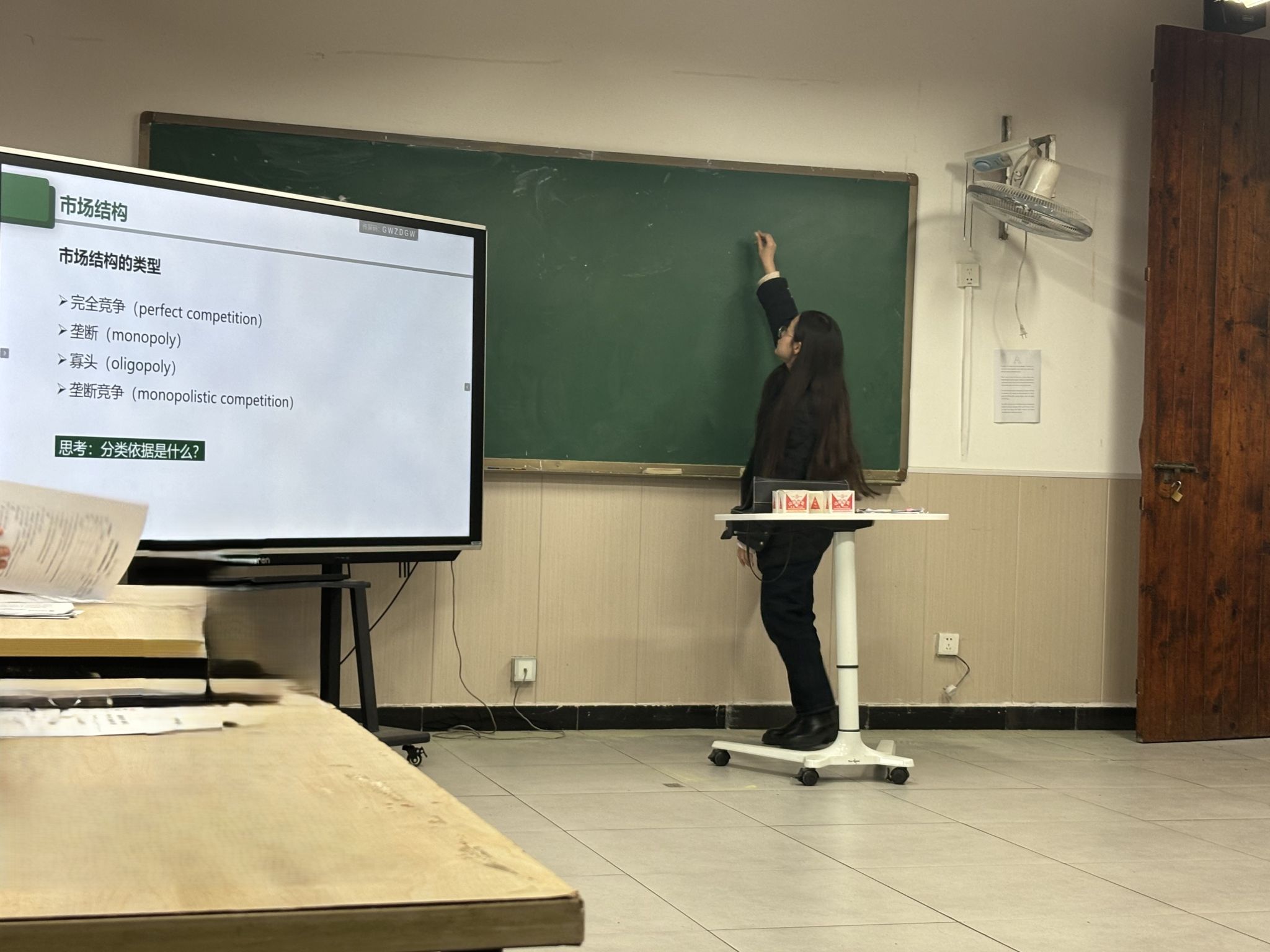 课程伊始,朱姝霖老师以提问的方式激发了同学们对市场的思考。她从市场结构的基本概念出发,详细讲解了完全竞争市场、垄断竞争市场、寡头市场和垄断市场等不同市场结构的特点,并强调了这些不同的市场结构对消费者福利和创新活动的影响。朱老师特别指出,在垄断市场中,社会的总经济福利并未达到最大化,这一点对于理解市场运作至关重要。