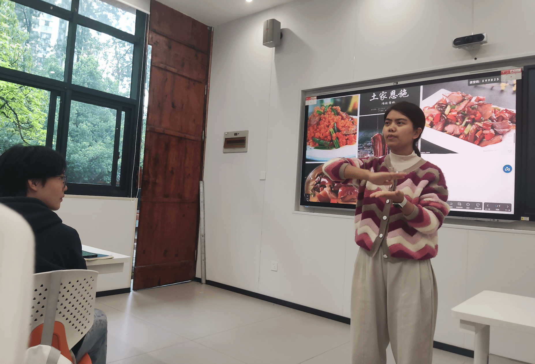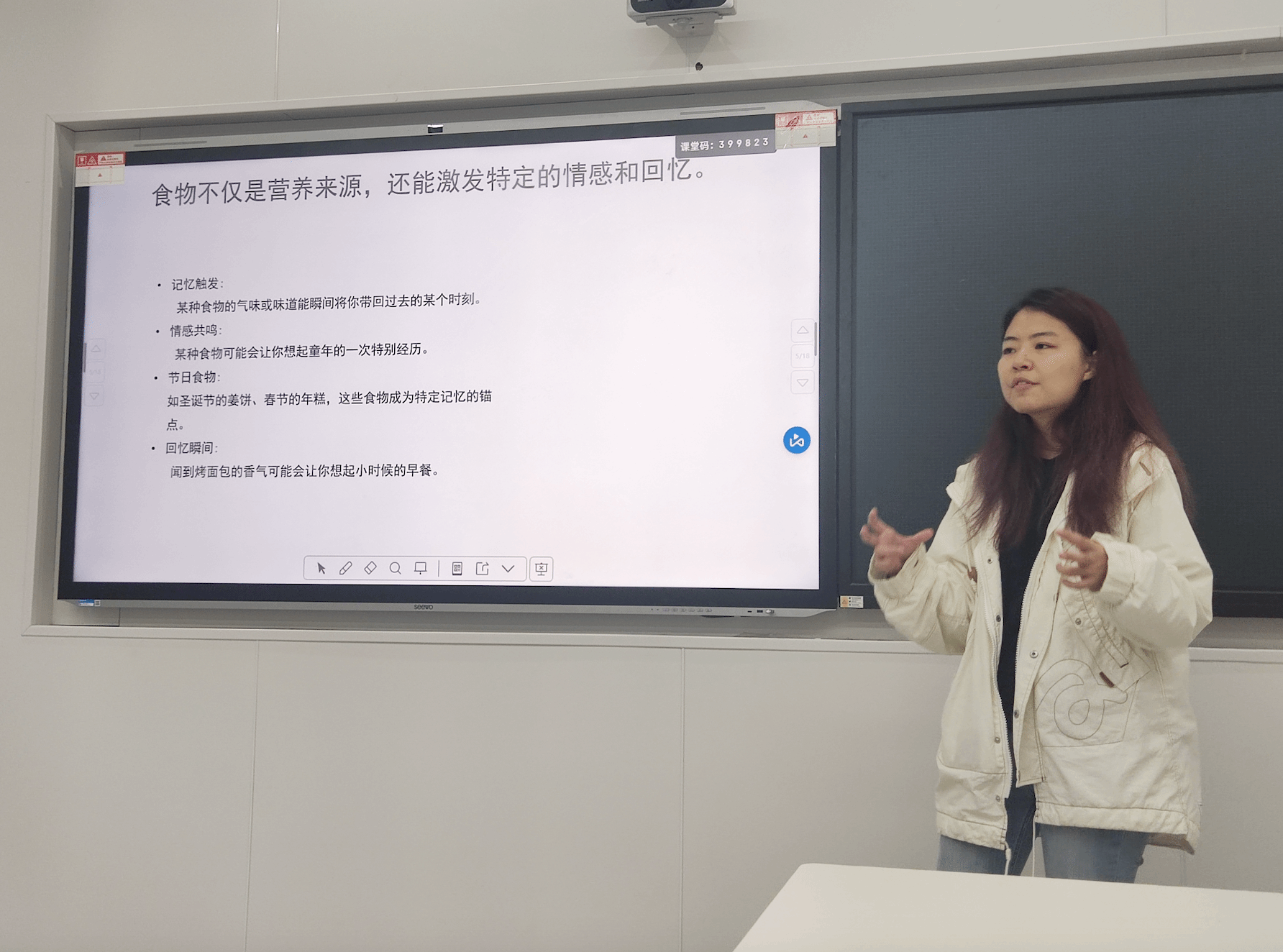 在讨论结束后,唐智盟老师带来了自己的家乡美食——恩施土家腊肉,分享了腊肉作为恩施美食文化代表的同时,也是她对家乡美味的记忆和思念。随后,唐老师将问题抛给了吴昊飞老师,询问他会选择带什么美食参加potluck party,并探讨了美食如何影响我们的情绪、感官和思维。