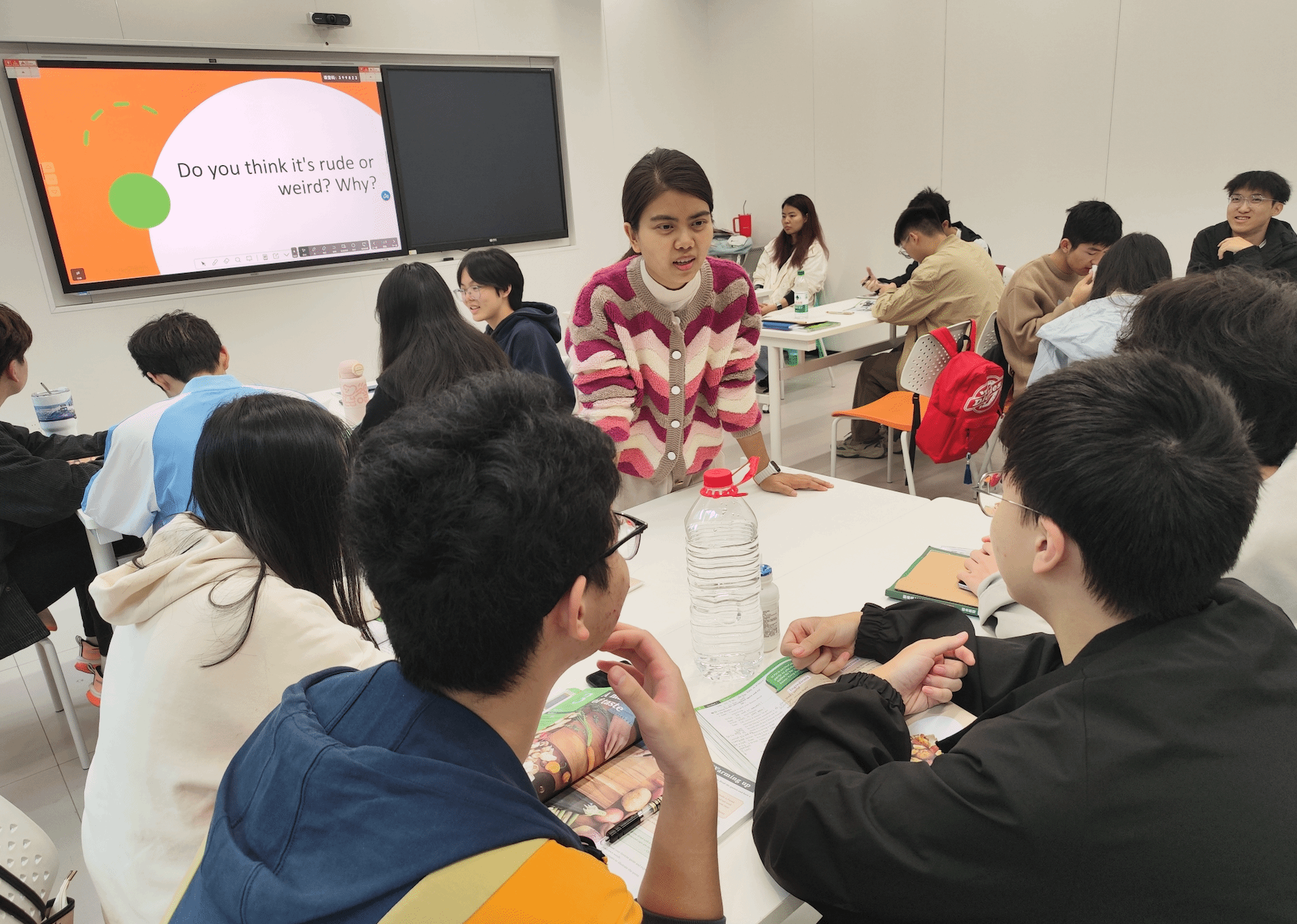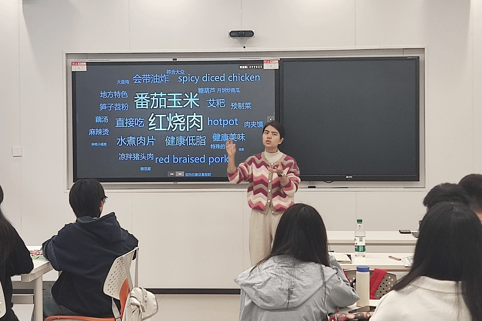 课程开始,唐智盟老师以“potluck party”这一美国聚餐文化为切入点,引出中国“百家饭”的文化传统,通过对比两种文化,带领学生理解外国文化的同时,也鼓励他们用英语传播中国传统文化。唐老师提出了一个互动问题:“如果参加一次potluck party,你会带什么菜?”这一问题激发了学生的讨论热情,小组讨论中,同学们给出了丰富多彩的答案。