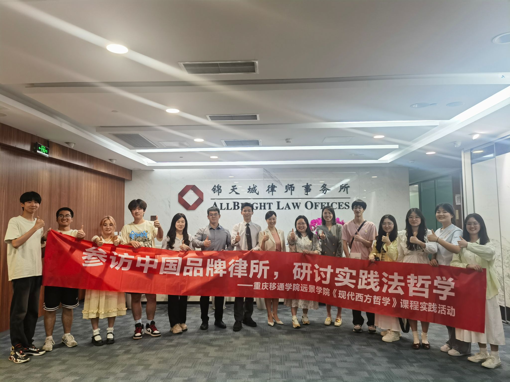 为持续深化远景学院哲学课程教育教学改革,加强与国内顶尖律所的联系,了解行业最新前沿与实践,2024年5月31日下午,远景学院哲学教师吴慈荷带领现代西方哲学班9位同学,参访位于重庆江北嘴国金中心的上海锦天城(重庆)律师事务所,师生们一行受到律所热情接待,在上海锦天城(重庆)律所合伙人陈如律师带领下参观律所,受邀参与上海锦天城(重庆)律所高级合伙人李章虎律师主持的由重庆市科学技术局、重庆市社会科学界联合会指导的重庆市科技发展基金会主办的“聚焦机器人与虚拟数字人”研讨沙龙,并与锦天城的资深律师们交流研讨实践法哲学。