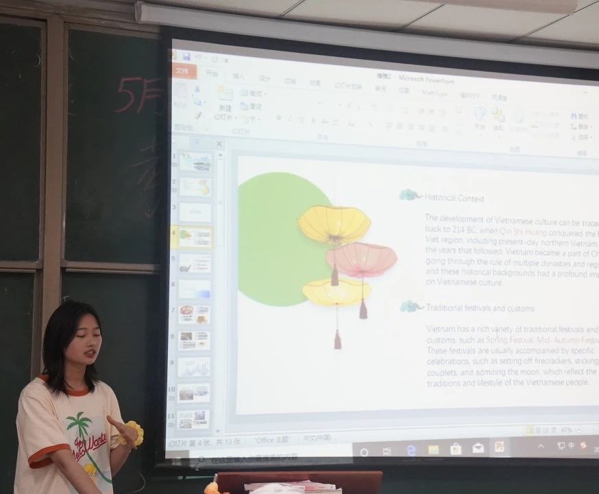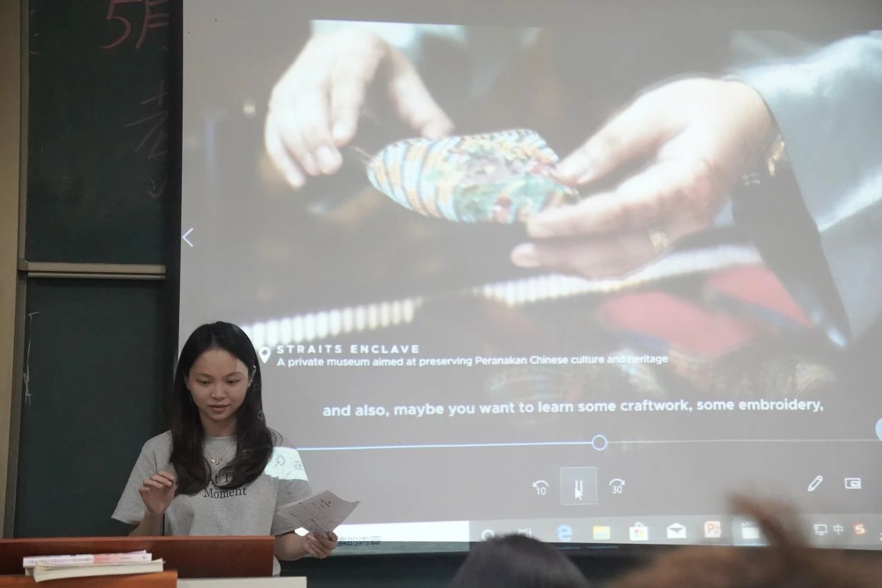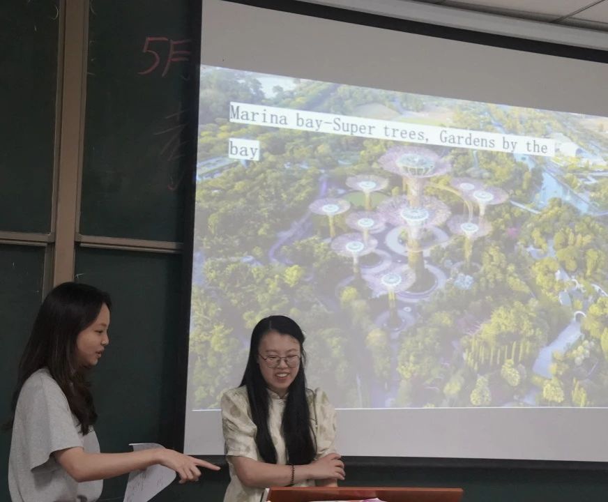 课程初始,做课前分享的罗林燕同学们精心准备了丰富的新加坡和越南的文化对比资料,通过翻转课堂的形式,成为课堂的主导者,带领着大家共同探索新加坡的历史、地理、饮食、宗教、语言等多方面的文化特色。从新加坡的著名景点和地标建筑开始,如滨海湾公园、鱼尾狮公园、小印度等,生动地演绎了新加坡多元文化共存的和谐场景。在这一环节中,从新加坡国立大学毕业的陈思含老师则从海滨湾公园的设计获奖、高科技手段融合,向学生们展示了新加坡的在环境可持续性方面的创新和努力,让同学们意识到新加坡在获得成功背后事对高科技技术创新的尊重和不懈追求,也是新加坡能逆袭的关键。