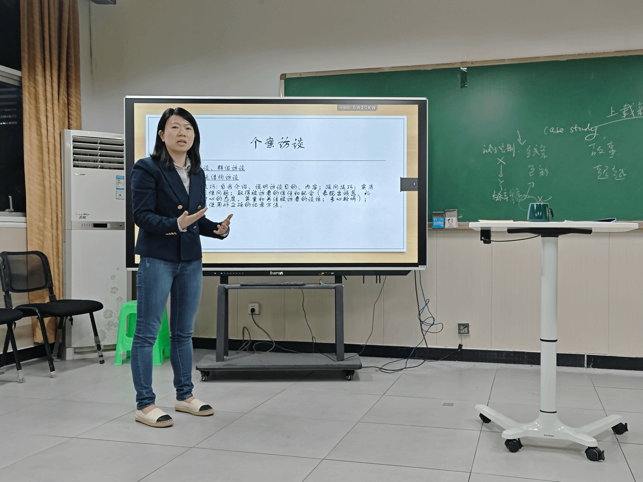 课堂伊始,李梦瑶老师对访谈法做了总体概述,从类型上分为:个案访谈、群组访谈、结构访谈与非结构访谈。她认为个案访谈是学生最应掌握的一种访谈形式,不仅可以探究被访者最真实的意图,还能确保访谈的客观性。其次,访谈的关键在于聆听,访谈者应当保持开放的心态,认真倾听被访者的观点和想法,不要过度参与,主观引导被访者。认真倾听可以快速建立访谈双方的信任关系,获取更真实的信息。同时,李老师也提醒大家在访谈进行时,要合理利用好录音笔等工具进行有效记录。