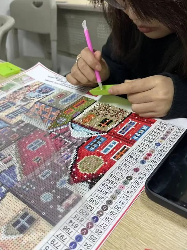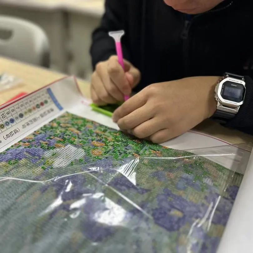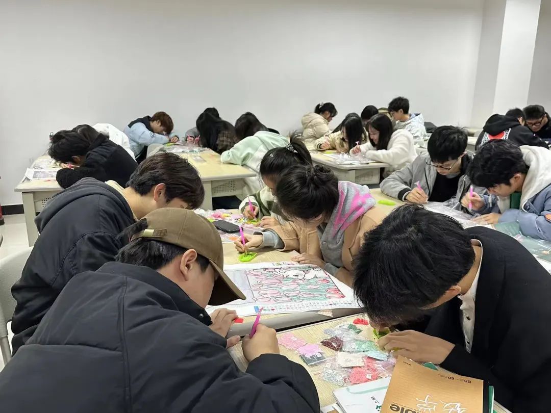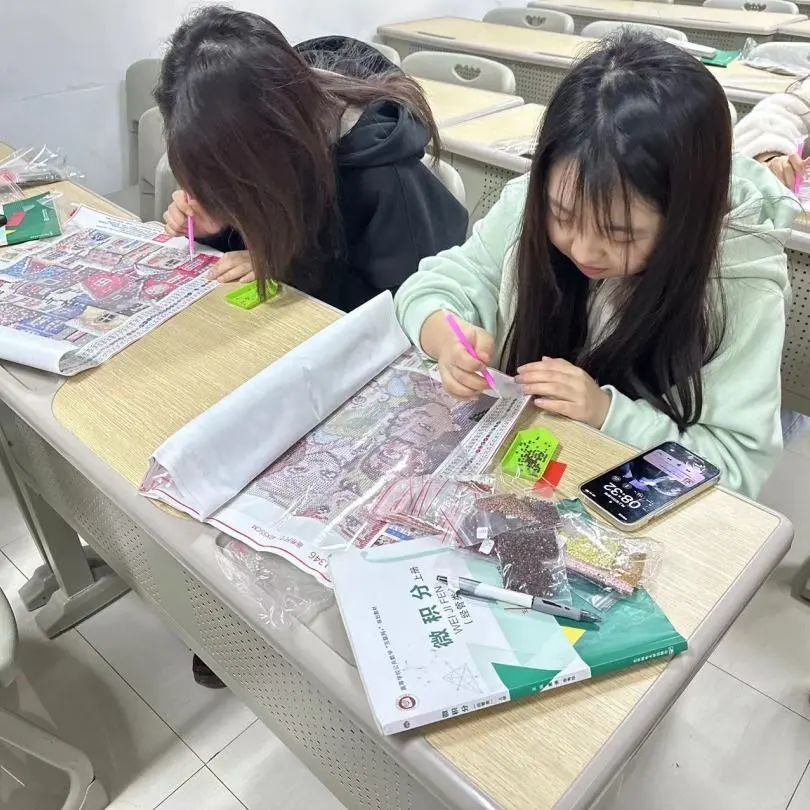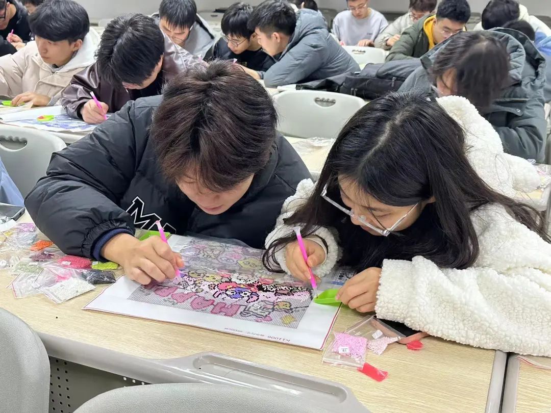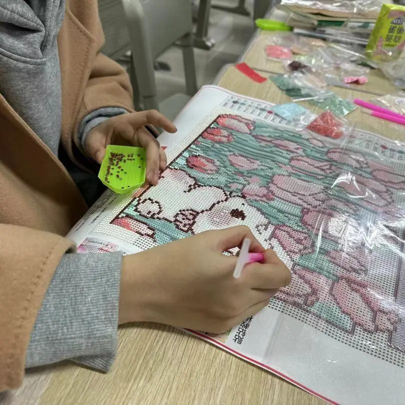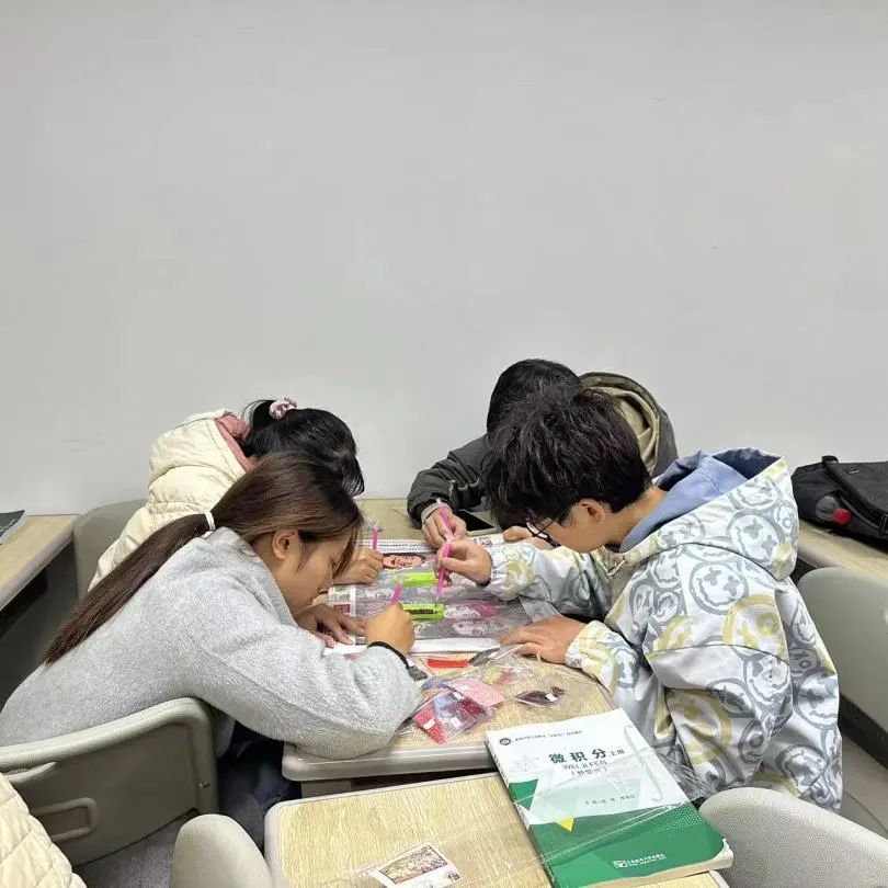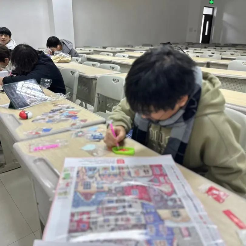 《微积分(1)》课程中,朱雪珂老师带领大家通过DIY钻石画来了解积分中最重要的微元法。钻石画是将画作分为n*n个细小的方形格子,将每个格子中粘上方底圆顶的各色钻石从而组合成色彩亮丽的各种图案。这和定积分中对曲边梯形进行“分割、近似、求和、取极限”的思想有异曲同工之妙。同学们通过将钻石贴入方格组成各类图案后,选取目标图形并采用两种方式计算图形的面试。较为原始的方法是数清图案中所含钻石数量,再乘以每颗钻石的面积从而得到整个图形的面积。“这对于一副画作而言是一个不小的工作量”,朱老师讲到:“我们如果利用积分进行计算那将会大大节省我们的时间,比如兔子的耳朵我们可以把顶端的部分看作是半圆,对一个半圆进行积分很快就能得到这个区域的面积,以此我们不用花大量时间数清细小钻石的颗数”。同学们通过粘贴钻石画不仅提高了动手能力,更是将积分中的微元法了解的更加透彻。