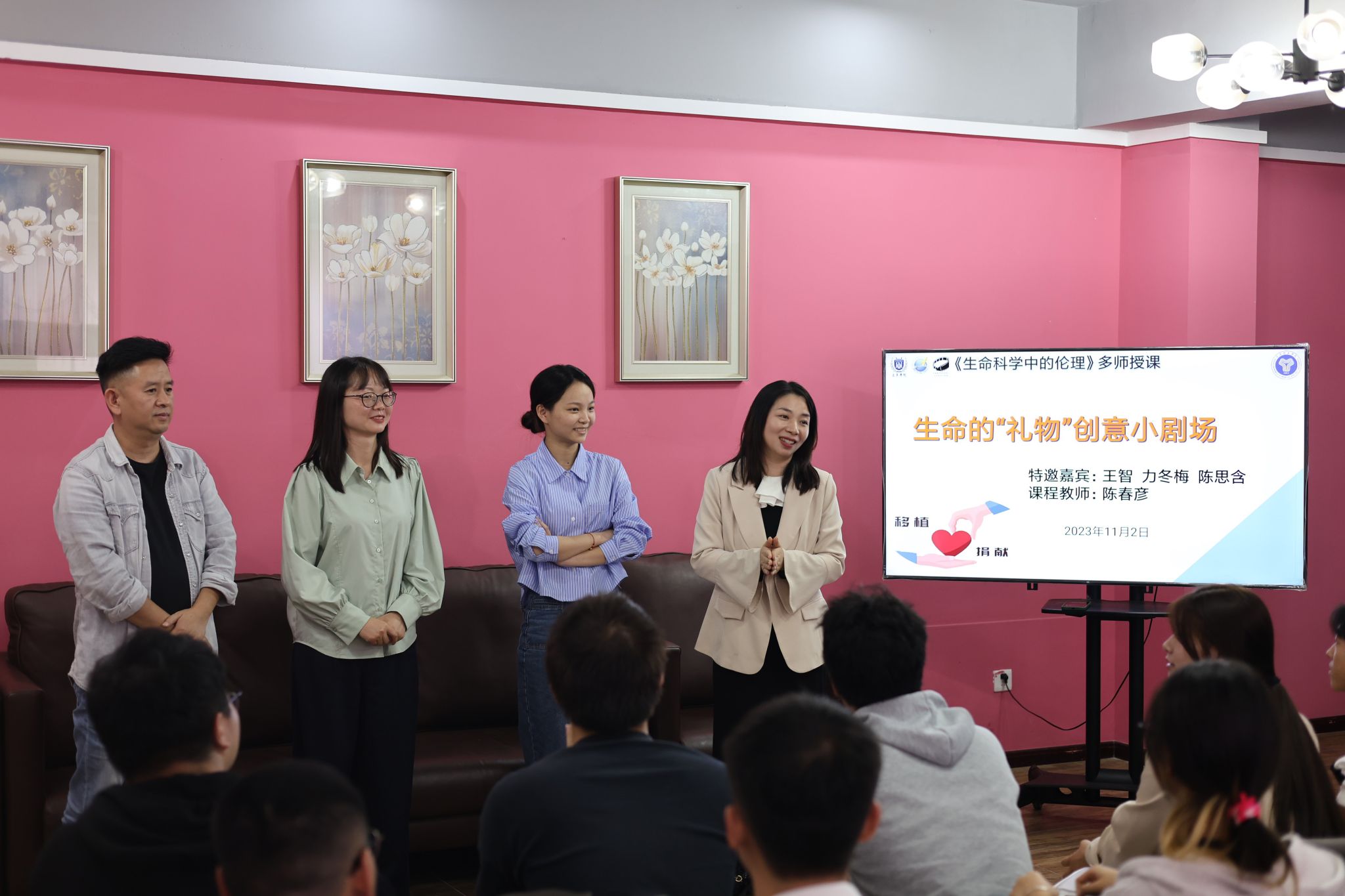 11月2日晚上19:00,远景学院《生命科学中的伦理》授课教师陈春彦邀请合川区电影电视艺术家协会主席兼创意写作学院教师王智、电影评论中心教师力冬梅及远景学院教师陈思含与2023级20名不同专业学生在爱莲书院艺术交流室开展了一堂以话剧表演、短视频展播为特色的多师课堂,现场表演生动,研讨氛围融洽。