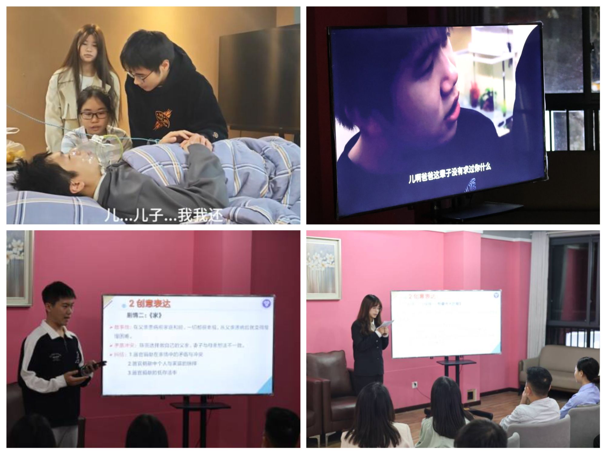 陈思含老师沉浸其中,她评价说这俨然是一个真实的作品,话剧演绎,现场代入感很强,在远景楼有限空间内进行场景变换、道具设计非常用心,短片播放以后就让我们自然进入了器官移植的伦理问题,两组同学创设的父亲“一生一死”的结局令人深思。看完短片后,会主动思考课堂内容,发散思维,这正是通识课堂的无限魅力。