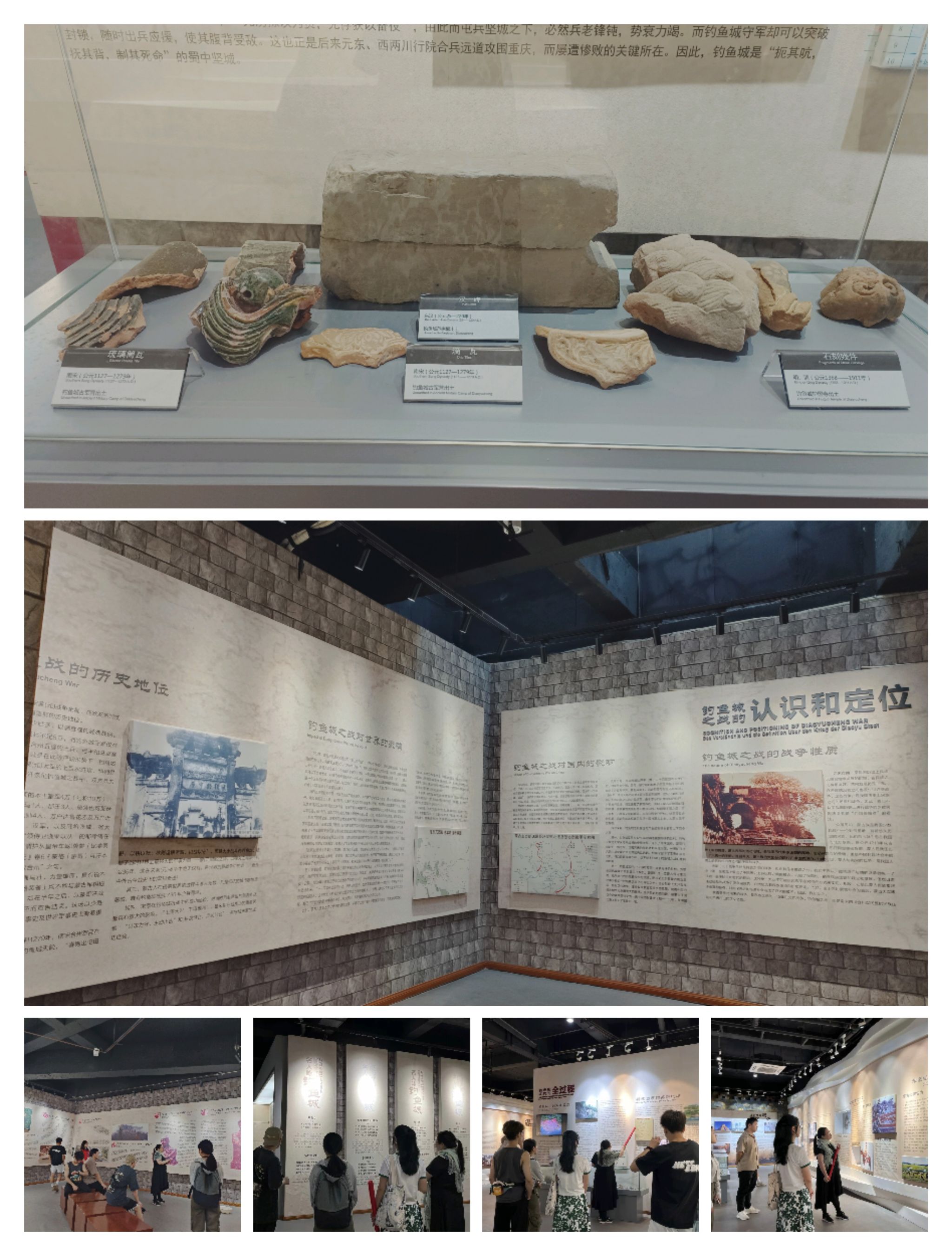 第一站——钓鱼城博物馆。一日之计在于晨,趁着晨光,大家来到这里,前期在解说员的讲解下,初步了解“钓鱼城”的由来。一段纪录片的放映,让大家对其历史背景有了一定把握。中期,在吴老师整体而详细的介绍下,同学们从政治、经济、文化、军事等方面对钓鱼城的战争历史形成了一个全局认知。后期,大家通过朗诵有关“钓鱼城”的诗词,思考其遗留的未解之谜,真切地感受它所积淀的历史文化。