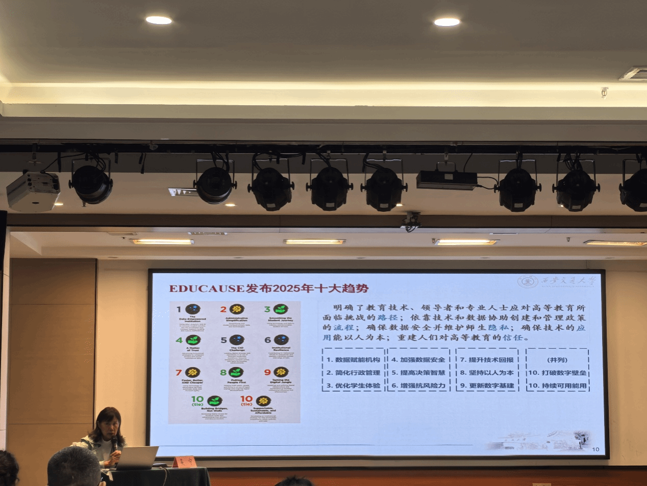西安交通大学吴宁教授从国家战略与全球视野出发,介绍了人工智能的发展现状及相关政策,并重点阐释了AI在教学实践中的具体应用。她指出,人工智能已深度融入教学全流程,成为推动教育“集成化、智能化、国际化”发展的关键力量。吴教授结合自身建课经验,详细讲解了知识图谱构建、个性化学习服务、AI助教助学等现代信息技术在课程建设中的应用路径,通过实例说明人工智能如何助力实现因材施教与教学评价创新。同时,她强调应注重教学设计,通过设置挑战性作业、组织分组研讨等方式激发学生深度思考,避免过度依赖网络资源。吴教授还提醒,尽管AI在教育领域展现出巨大潜力,仍需理性看待其在伦理、意识形态等方面的潜在风险,坚持以“人机协同”推动教育高质量发展。