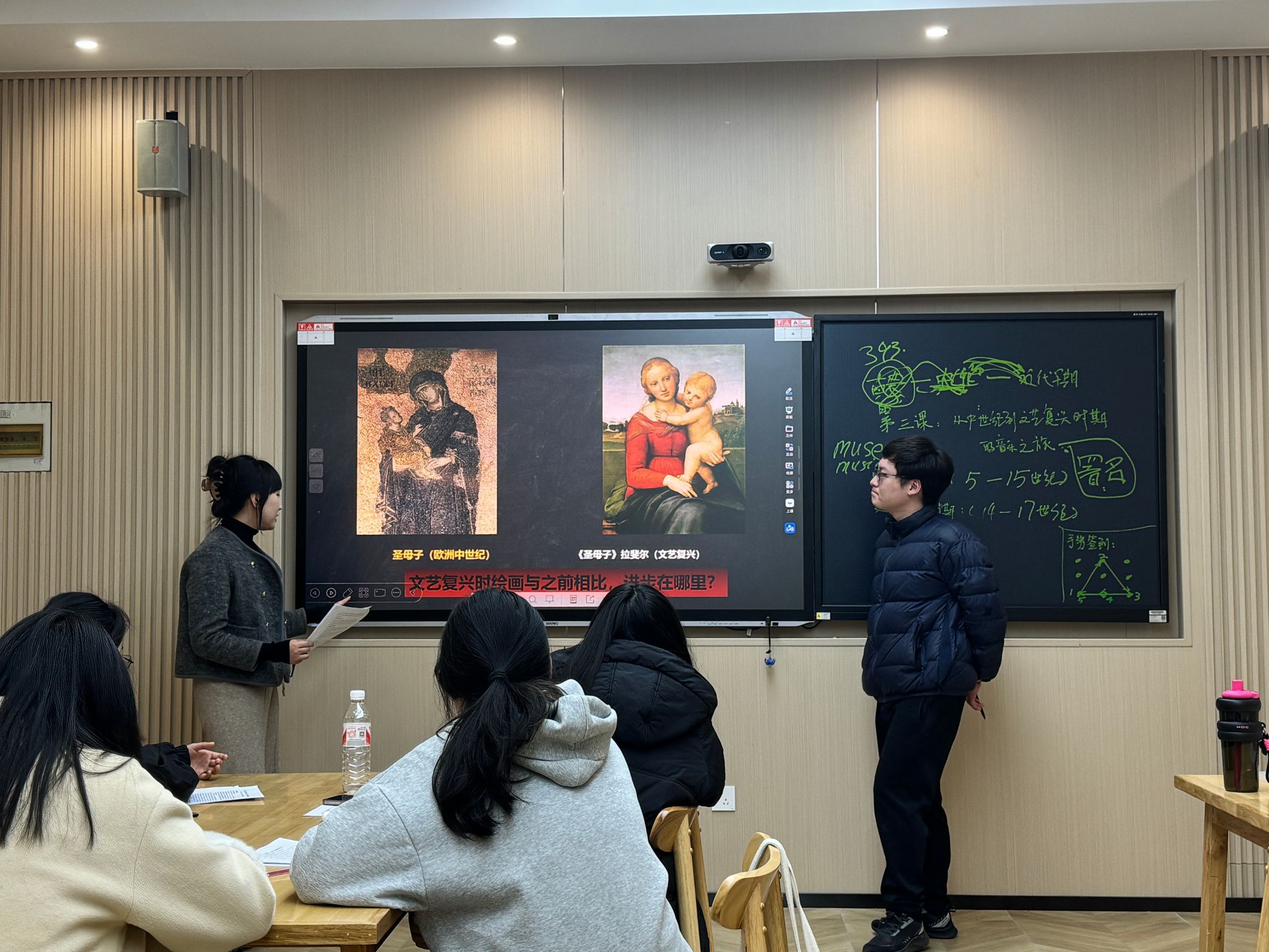 首先,鲁明宙老师展开承载历史厚重感的时间轴,精准标注中世纪至文艺复兴的关键节点。东罗马覆灭、宗教艺术、古登堡印刷术的问世,这些事件影响世界格局,也悄然改变音乐与历史的发展走向。鲁老师围绕它们提问,瞬间点燃课堂,激发学生对历史的探索热情。鲁老师深入剖析中世纪音乐与宗教的联系,把修道院比作“藏经阁”,拉丁文是“密码”,音乐则为信徒与上帝沟通的“灵犀”。随后,鲁老师展示了一幅拜占庭时期的宗教艺术绘画《宝座上的圣母与圣婴》,提出让同学们观察其中的人物,同时对绘画中的人物与历史进行了精准的讲解,学生们对宗教艺术产生了浓烈的兴趣,并引导同学们思考“观察那生动的衣纹,那准确的躯体,同学们觉得美观吗?”。随后,鲁老师还展示了乔托的《宝座上的圣母子》,以及拉斐尔的《西斯廷圣母》绘画,谈及文艺复兴,他结合宗教中的圣母图的演变,让学生深刻认识到宗教艺术与时代发展紧密相连,见证艺术在时代浪潮中不断演变。这不仅是知识的传递,更是在引导学生感悟艺术背后时代的更迭与人类思想的进步。