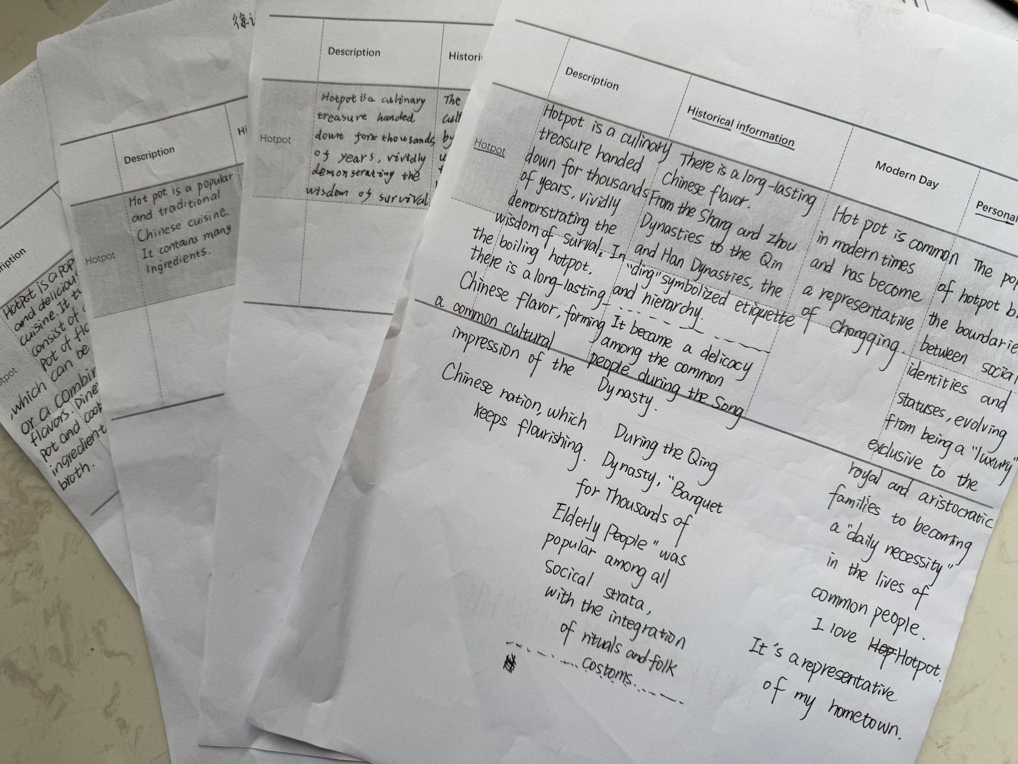 在博物馆的参观过程中,同学们手里紧握着实践手册,带着黄煌老师精心设计的一系列问题,积极地沟通交流,深入地探索火锅文化的精髓。同学们通过亲身体验、阅读历史资料等方式,在实践册中记录下了丰富和详尽的内容。同时,同学们不断地积累关于各类火锅文化的来源与特点,并将Unit3的美食评价标准运用于博物馆中展示的南北火锅点评中。