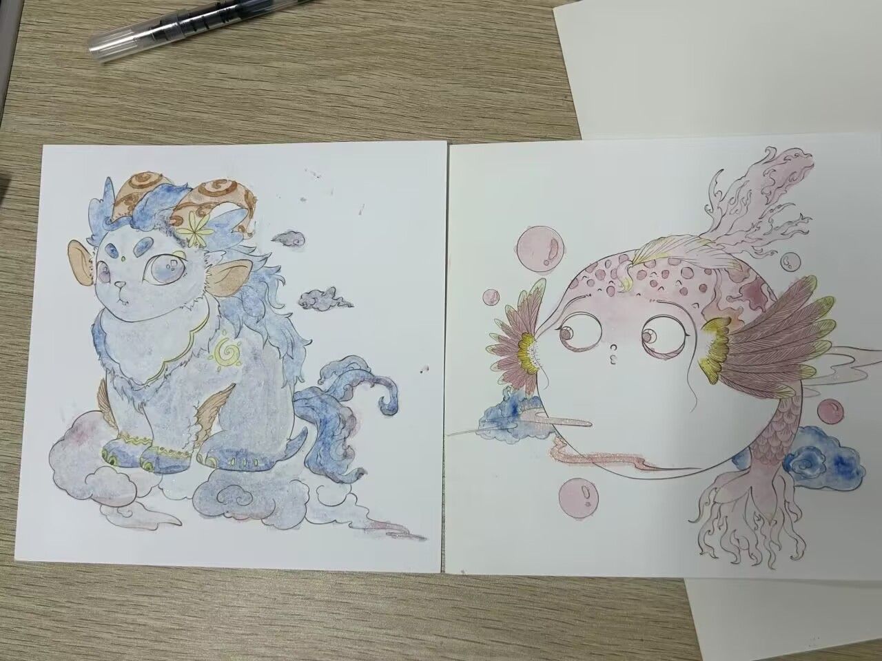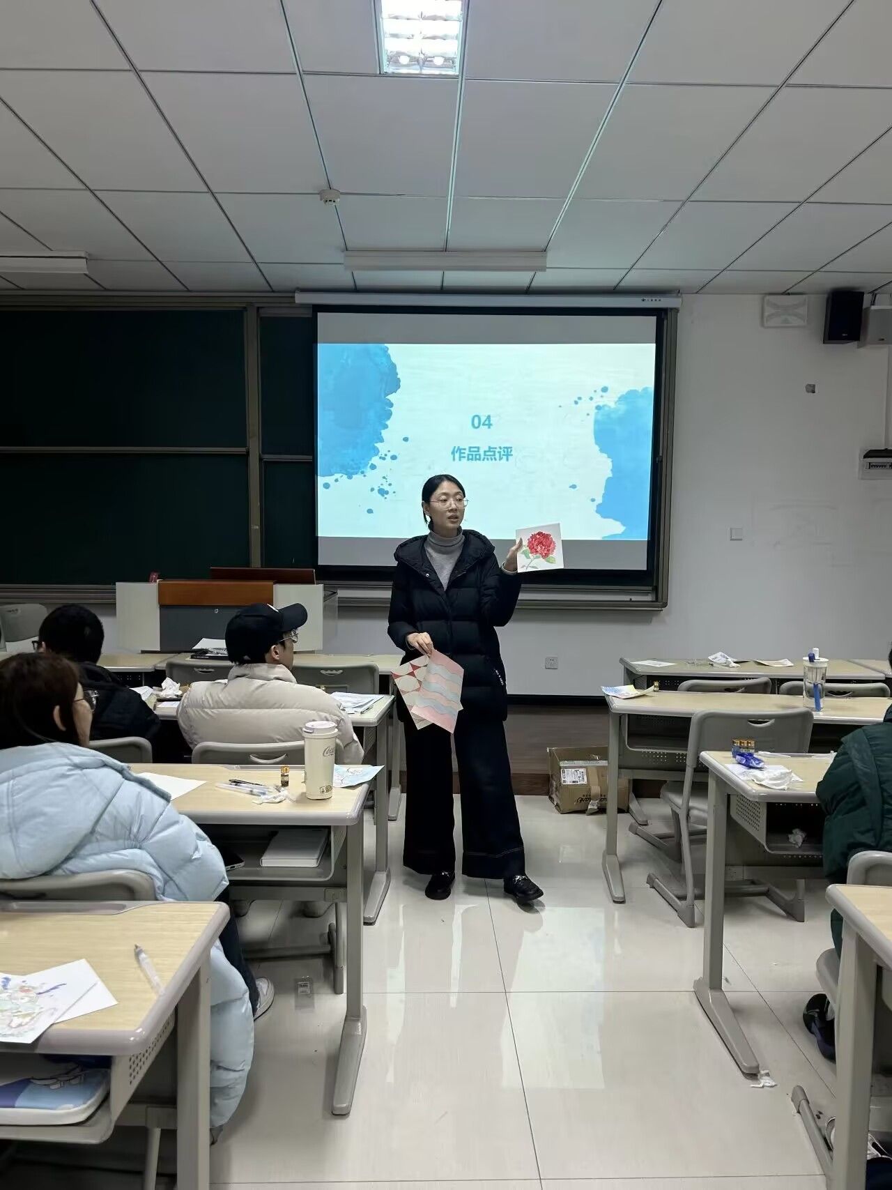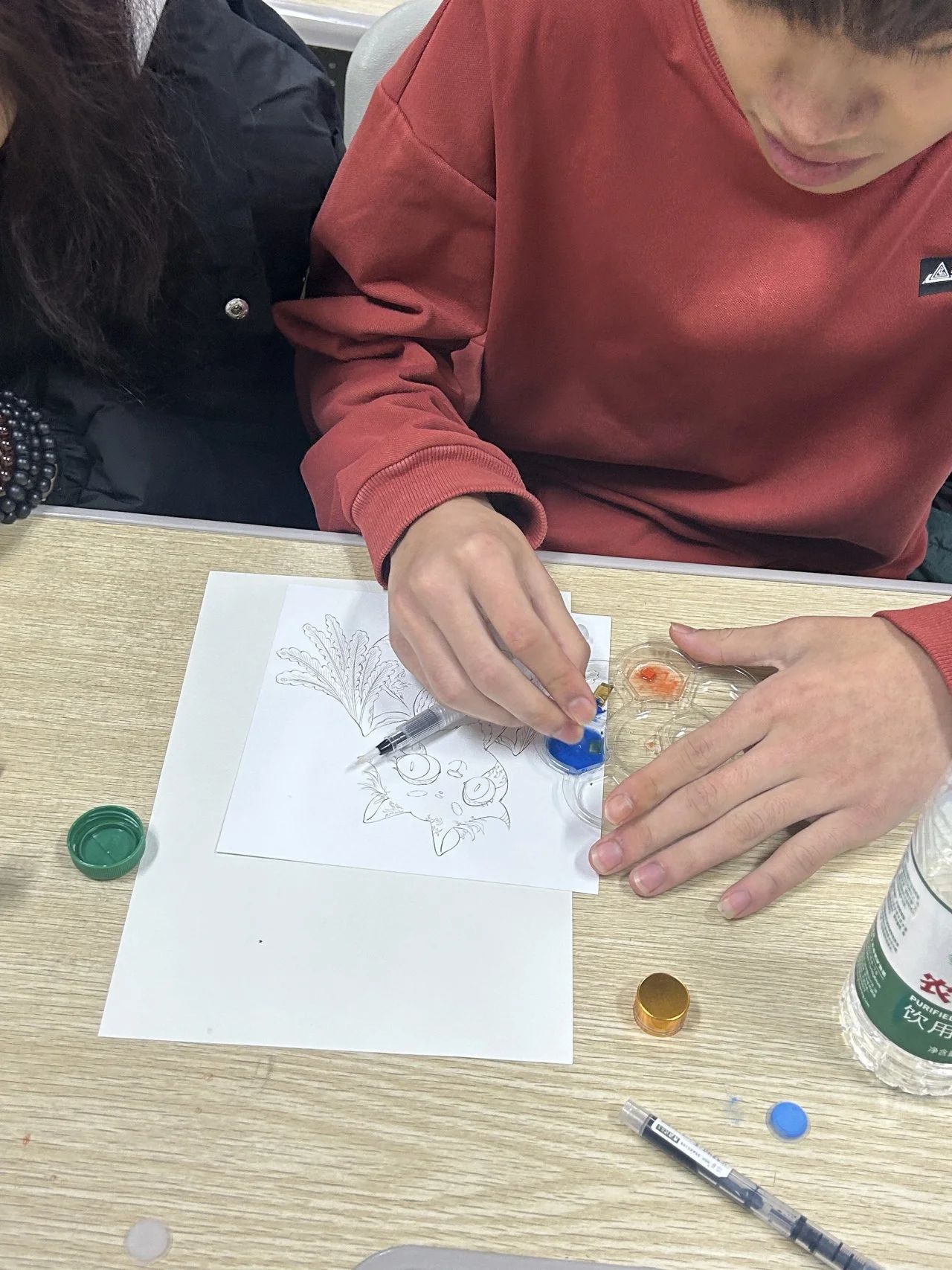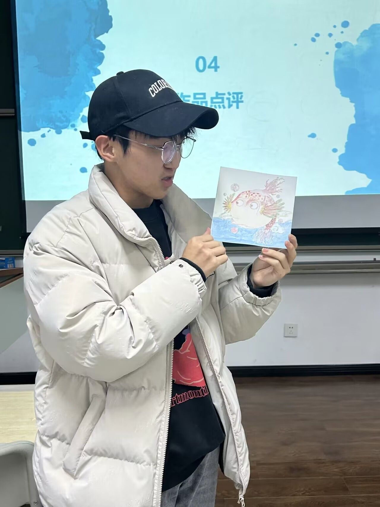 完成画作后,钟婷婷老师邀请了何威衡和陆定宏等同学展示自己的作品,同学们在讲解自己巧妙构思的同时,还惊喜的发现了矿物原料区别于传统原料,不仅色彩鲜艳持久,而且在调和与使用上更加灵活多变,为画作带来了前所未有的表现力与层次感。当然,展示中也不乏轻松愉快的时刻。一些同学大胆尝试的配色方案,虽然初看之下略显突兀,但在他们的巧妙构思下,却意外地营造出了一种别具一格的视觉效果,引得在场师生笑声连连。