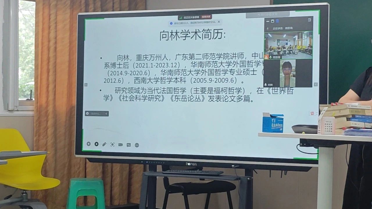 为探索哲学通识教育的“内涵建设与质量提升”的多元途径,结合人工智能时代的多种新技术,2024年6月7日上午10-12点,远景学院《现代西方哲学》课程教师吴慈荷邀请广东第二师范学院讲师、中山大学博士后、福柯研究专家向林博士,利用腾讯会议,给远景学院现代西方哲学班同学们带来一场精彩的线上线下联动的哲学双师课。